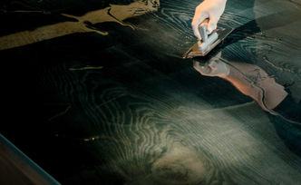 Un’unica plancia di 5 metri di larice olivato, con finitura in ottone e lavorazione in resina, si ispira ai colori e ai temi della natura: al blu intenso del cielo e di un fiume impetuoso, allo scorrere dell’acqua e alle incertezze del mondo naturale, che ne caratterizzano la perfezione, nella sua unicità.